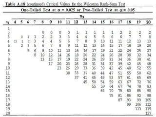 The document describes the Wilcoxon Rank-Sum Test, a non-parametric statistical hypothesis test used to assess whether one of two independent samples of observations tends to have larger values than the other when normality cannot be assumed. It provides details on running the test, including ranking the combined observations and computing the test statistic to determine if it is less than or equal to the critical value, rejecting the null hypothesis. An example applies the test to compare the nicotine content of two cigarette brands, finding no significant difference between their medians.