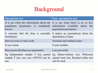 The Wilcoxon signed-rank test is a non-parametric statistical hypothesis test used to compare two related samples or repeated measurements to determine if their population mean ranks differ, serving as an alternative to the paired t-test when normal distribution cannot be assumed. It requires paired data from the same population and assesses the significance of differences in ranks. The document also includes guidelines for conducting the test and examples illustrating its application.