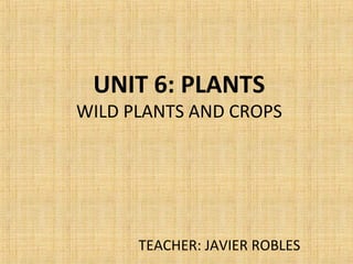 This document discusses wild plants and crops. It explains that daisies, lavender, and dandelions are examples of wild plants that grow without care in many places. In contrast, wheat, sunflowers, and broccoli are crops that farmers plant, water, and harvest for food. Farmers grow crops by planting seeds and looking after the plants.