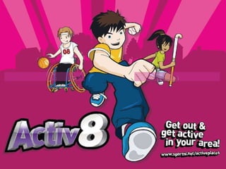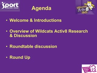 The Wildcats Activ8 Club Forum meeting agenda included welcome and introductions, an overview of the Wildcats Activ8 program, and a roundtable discussion. The Wildcats Activ8 program is a physical activity campaign run by Sport Northern Ireland that targets children, adults, older adults, and develops multi-skill programs. It is supported by various partner organizations and generates interest through over 50 clubs throughout Northern Ireland.
