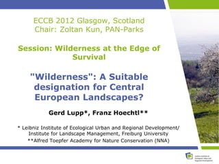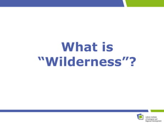The document discusses the concept of "wilderness" in a Central European context. It provides examples of areas that could potentially be considered wilderness in Central Europe, such as long-unmanaged forests and former industrial sites. However, there is no universal definition of wilderness. The document also summarizes the results of a survey conducted in Mueritz National Park, Germany, which found that visitors generally have positive connotations with wilderness but definitions varied depending on lifestyle and education levels. While some saw the park as wilderness, others felt it showed too many signs of human impacts. The concept of wilderness may still be relevant for Central Europe if carefully defined and communicated.