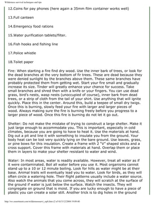 The document provides wilderness survival techniques and tips. It lists essential items to include in a basic survival kit such as waterproof matches, a knife, compass, first aid supplies, emergency food and water purification tablets. It also gives advice on finding water, making fire and shelter, and signaling for help. Proper preparation is key to surviving in the wilderness.