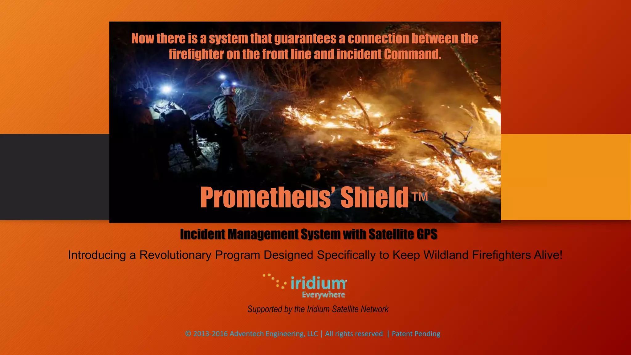 Prometheus' Shield is an advanced incident management system designed to enhance safety for wildland firefighters by ensuring constant communication between them and incident command using satellite GPS and Iridium satellite technology. The system includes various applications such as RFID identification, personnel tracking, and GIS mapping to manage resources and incidents in real time. Developed in response to the tragic Yarnell Hill fire that claimed the lives of 19 firefighters, the program aims to prevent similar tragedies through improved coordination and oversight.