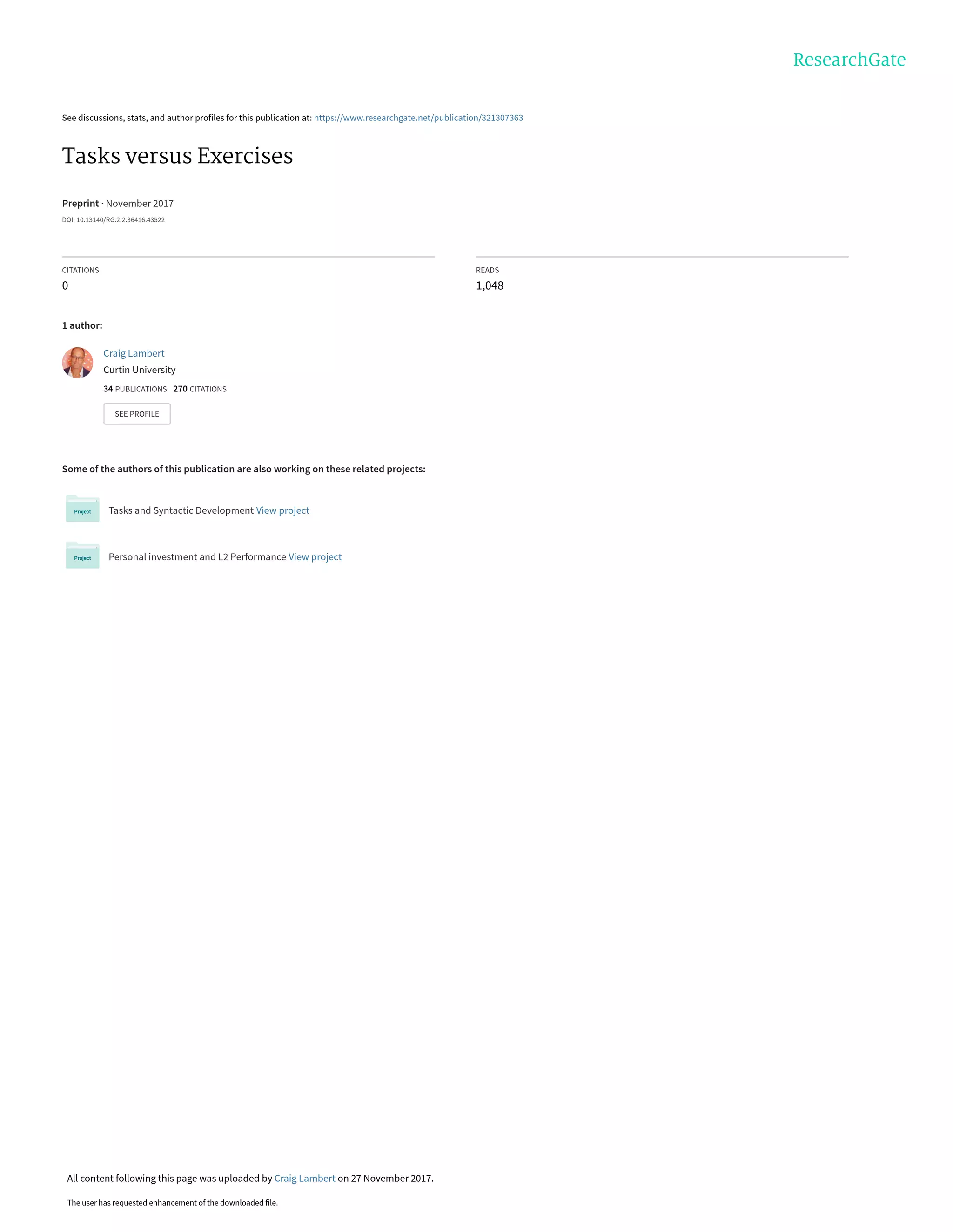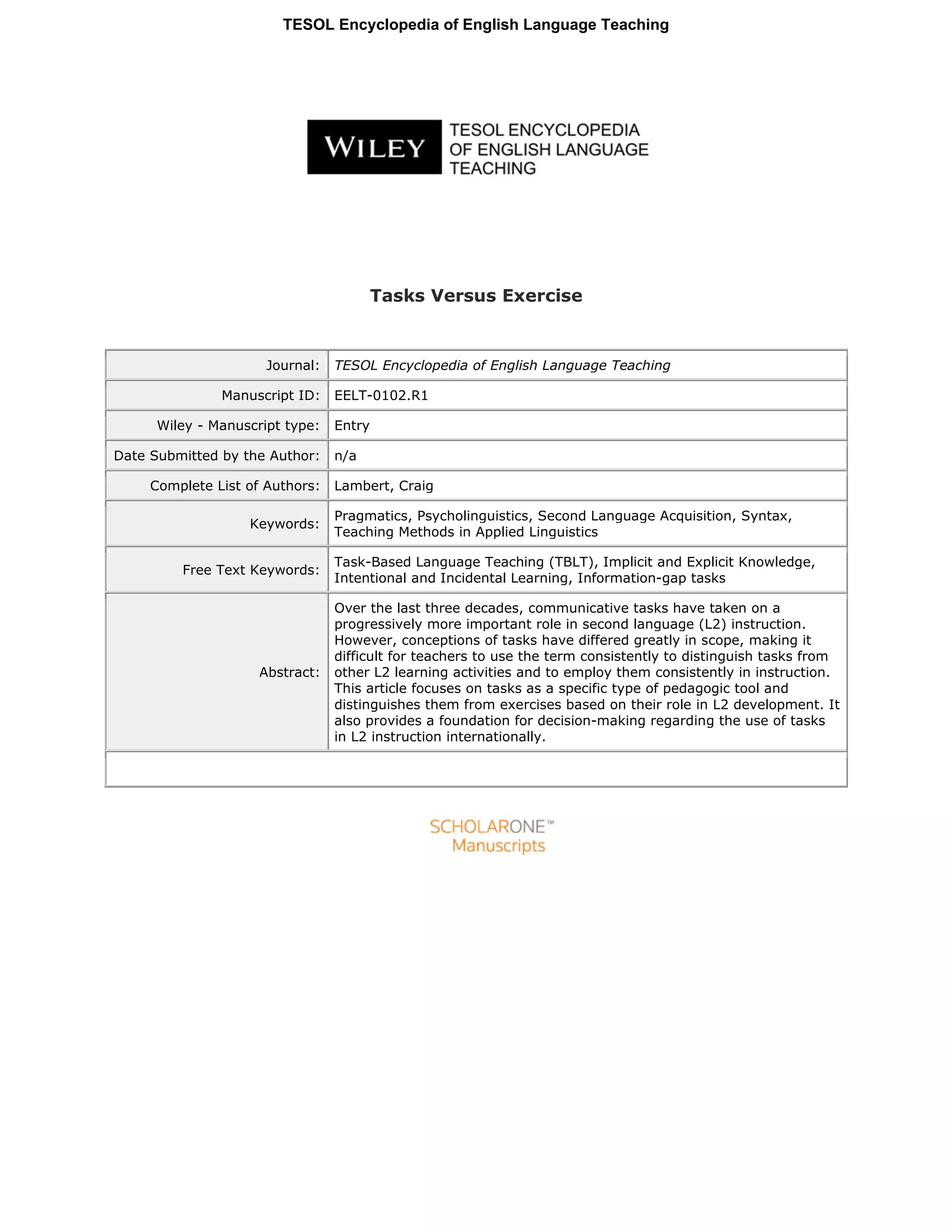This document summarizes the key differences between tasks and exercises in second language teaching. Tasks are distinguished from exercises based on four criteria: 1) a primary focus on meaning, 2) a communicative gap that motivates language use, 3) participants using their own resources, and 4) a clearly defined communicative outcome. Tasks are argued to develop implicit linguistic knowledge, while exercises can develop explicit knowledge. The document discusses three approaches to incorporating tasks in language teaching based on theories of the relationship between implicit and explicit knowledge: a task-supported approach, a task-based approach, and a modular approach.