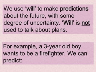 This document discusses the use of the future tense "will" in English. It explains that will is used to make predictions about the future with uncertainty or to express willingness to do something. The document provides examples of affirmative, negative, and question structures using will. It also includes contractions like "I'll" and an activity asking the reader to write predictions about their life using will.