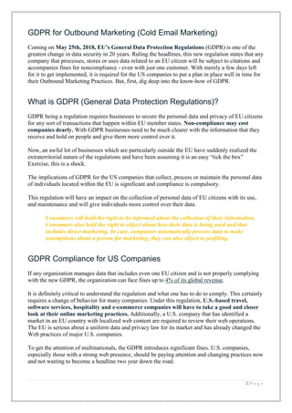 The document discusses the implications of the EU's General Data Protection Regulation (GDPR) for outbound marketing practices, especially for U.S. companies. It emphasizes the necessity for businesses to secure explicit consent for data use, impacting cold email marketing strategies by requiring transparency and clear opt-out options. Companies that fail to comply with GDPR face significant fines, making it crucial to adapt their marketing practices to align with the new regulations.