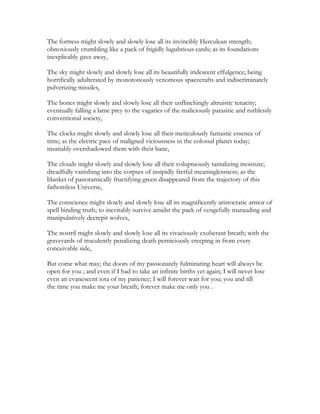 The document expresses that while many things in the world may slowly fade away or deteriorate over time, such as natural phenomena, human qualities, and man-made structures, the speaker's passionate heart and feelings of love for another will never diminish or be lost, even if they had to endure endless rebirths. They will remain forever patient and waiting for the other, desiring to be united with them as their breath, to belong only to them.