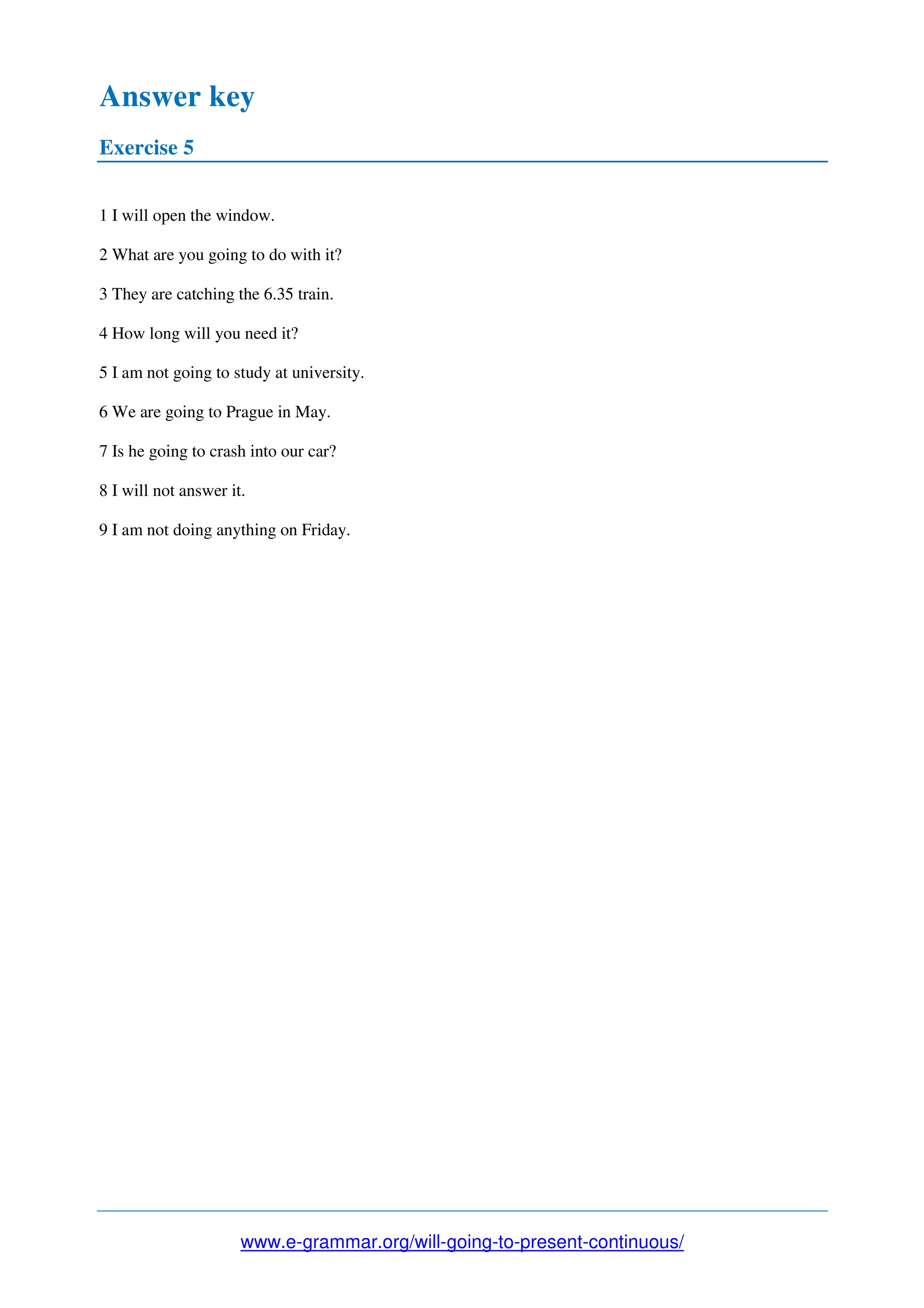 This document provides an exercise to practice using will, going to, and the present continuous tense to talk about future events and plans. The exercise consists of 9 sentences with blanks that must be filled in using the words provided in brackets. An example is given and the answers are provided at the end. The purpose is to practice forming sentences using these grammatical constructions to discuss future actions and intentions.