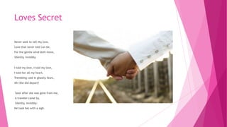 William Blake was an English poet, painter and printmaker active in the late 18th and early 19th centuries. Though largely unrecognized during his lifetime, he is now considered an important figure of the Romantic Age. Some of his most famous poems include "Loves Secret", "The Sick Rose", and he is known for quotes such as "To see a World in a Grain of Sand".