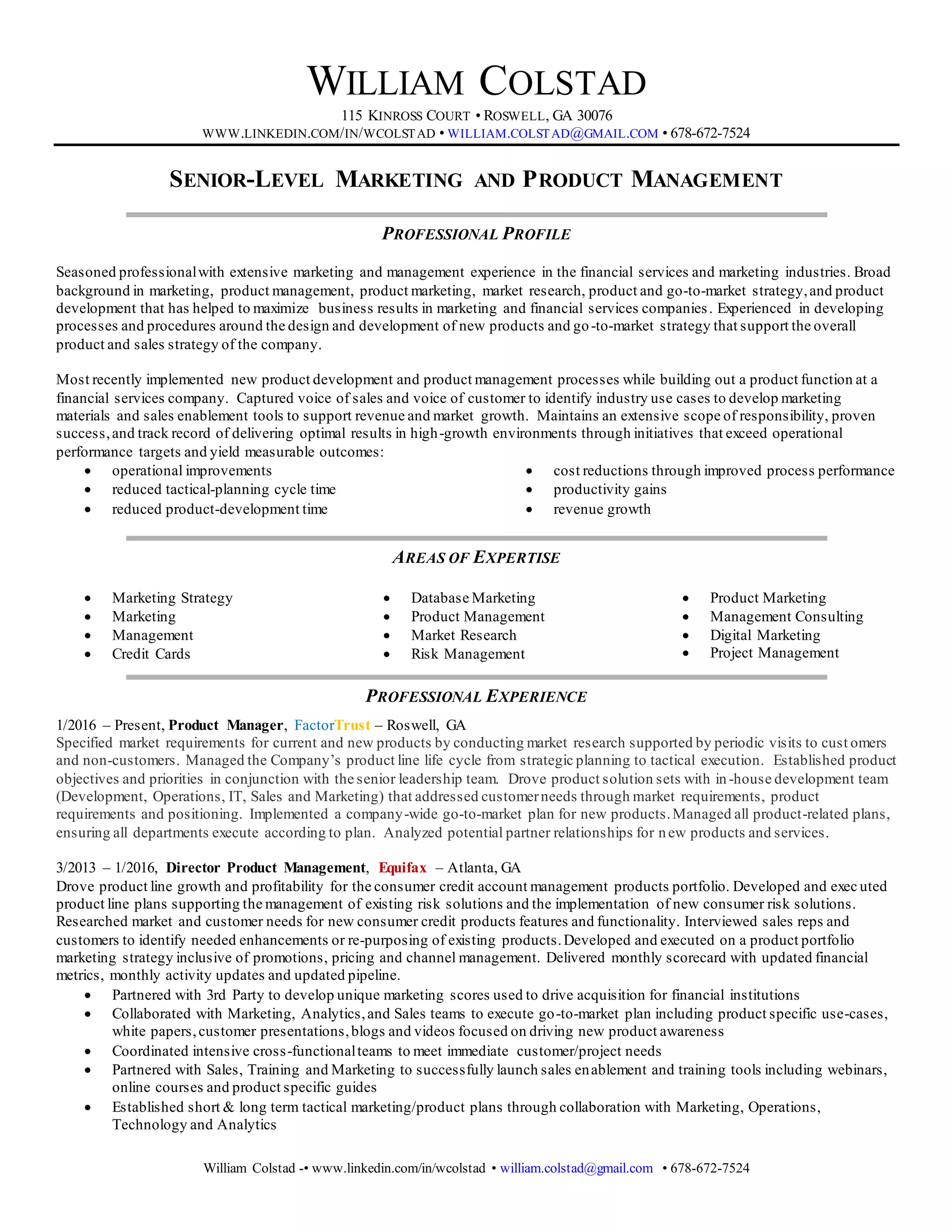 William Colstad has over 15 years of experience in marketing, product management, and risk management in the financial services industry. He is currently a Product Manager at FactorTrust where he launched a new product development process. Previously he held roles as Director of Product Management at Equifax and Business Consultant Manager at SapientNitro. He has expertise in areas such as marketing strategy, product marketing, credit cards, and digital marketing.