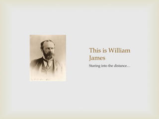 William James was born in 1842 in New York City to a wealthy family. He studied physiology, chemistry, and attended medical school but struggled with deciding on a career path due to ongoing back pain. After becoming depressed due to this indecision, he found new purpose in psychology. James went on to make major contributions to the fields, including establishing pragmatism and functionalism as philosophical approaches and proposing the James-Lange theory of emotion. He is regarded as the father of American psychology.