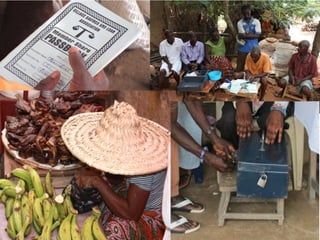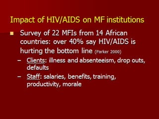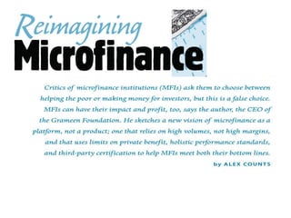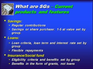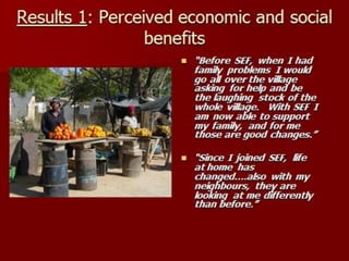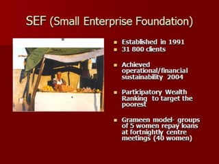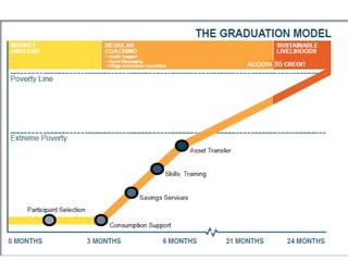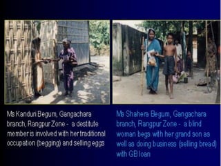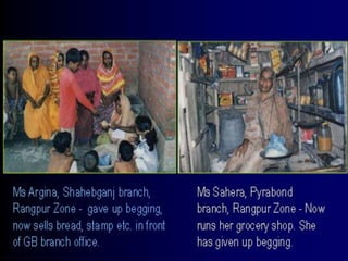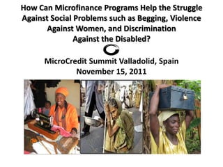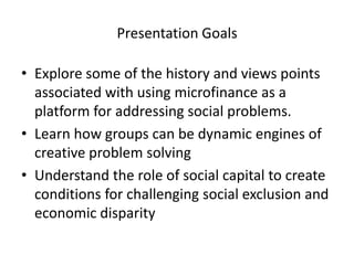 This document discusses how microfinance programs can help address social problems through building social capital and networks. It provides examples of microfinance programs that have helped reduce begging in Bangladesh by moving beggars to marketplace work. It also discusses how microfinance groups in Uganda have empowered the disabled, with one blind woman elected as city councilor. The document advocates for an integrated approach using microfinance to create health solutions through partnerships while targeting the ultra-poor.