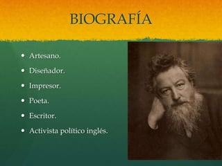 William Morris was an English artist, designer, poet, writer, and political activist. He was a founding father of the Arts and Crafts Movement. Some of his most notable works include The Defence of Guinevere, and other Poems, News from Nowhere or An Epoch of Rest, and The Well at the World's End. As a designer, he helped develop decorative arts like the Golden, Troy, and Chaucer typefaces. He believed in an aesthetic philosophy that valued beauty, utility, harmony, and craftsmanship.