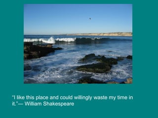 This document contains 6 quotes about nature and the beauty of the earth. William Shakespeare expresses how he could spend his time enjoying California's beauty. Rachel Carson discusses how nature provides strength and healing through its patterns and cycles. Ralph Waldo Emerson advises adopting nature's patience. Christopher Paolini describes the sea as embodying emotion that cannot be captured by words. John Keats' quote is repeated, saying the poetry of the earth is never dead.