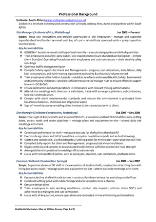 William Renney is a site manager with over 10 years of experience in mining and construction projects involving earthworks, excavation, road building, and pipeline installation. He has consistently delivered projects on time and on budget while ensuring safety and regulatory compliance. Renney is skilled in planning, leadership, and achieving productivity targets through effective management of large teams and equipment. He currently oversees one of the largest sites in his company, with a monthly turnover of R15M.