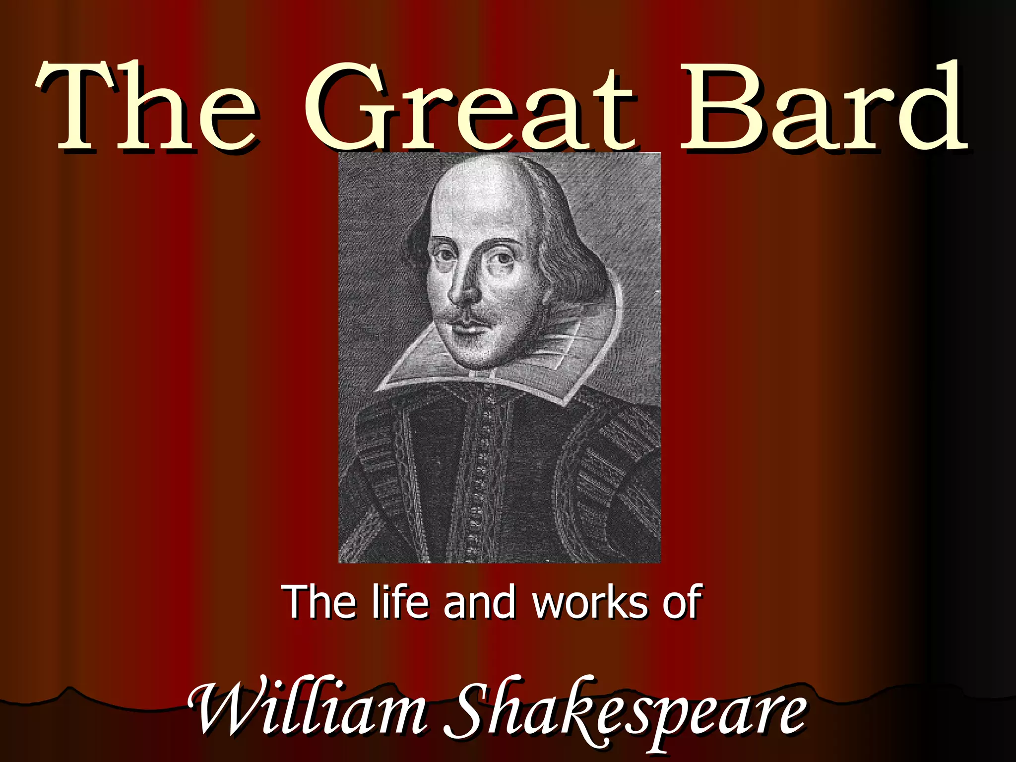 William Shakespeare was born on April 23, 1564, in Stratford-upon-Avon, England, and he married Anne Hathaway in 1582. He wrote 37 plays and 154 sonnets, becoming a significant figure in the London theater community, notably performing for Queen Elizabeth and owning part of the Globe Theatre, which was built in 1599. He passed away on April 23, 1616, and is buried at Holy Trinity Church, with an epitaph believed to be inscribed by himself.