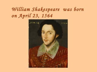 William Shakespeare was born in 1564 in Stratford-Upon-Avon, England. He married Anne Hathaway and had three children, though he later left his family to pursue a career in London as a playwright where he wrote famous plays such as A Midsummer Night's Dream, Hamlet, and Romeo and Juliet for Queen Elizabeth I and helped build the Globe Theater which later burned down. Shakespeare died in 1616 in Stratford-Upon-Avon.
