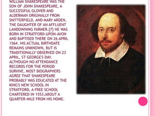 William Shakespeare was born in Stratford-upon-Avon in 1564 and baptized there on April 26. He married Anne Hathaway in 1582 and had three children with her. Shakespeare had a successful career as a playwright and poet in London, writing around 38 plays. He was a shareholder and house playwright for the Lord Chamberlain's Men/King's Men acting company. Shakespeare died in Stratford in 1616 at the age of 52 and was buried there.