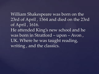 William Shakespeare was born in Stratford-upon-Avon, England in 1564 and died in 1616. He is known for writing 38 plays, 154 sonnets, and several long poems. Some of his most famous plays include Romeo and Juliet, Hamlet, Macbeth, and A Midsummer Night's Dream. Shakespeare was a pioneering writer who coined many new words and phrases that became part of standard English. He is widely regarded as one of the greatest writers in the English language.