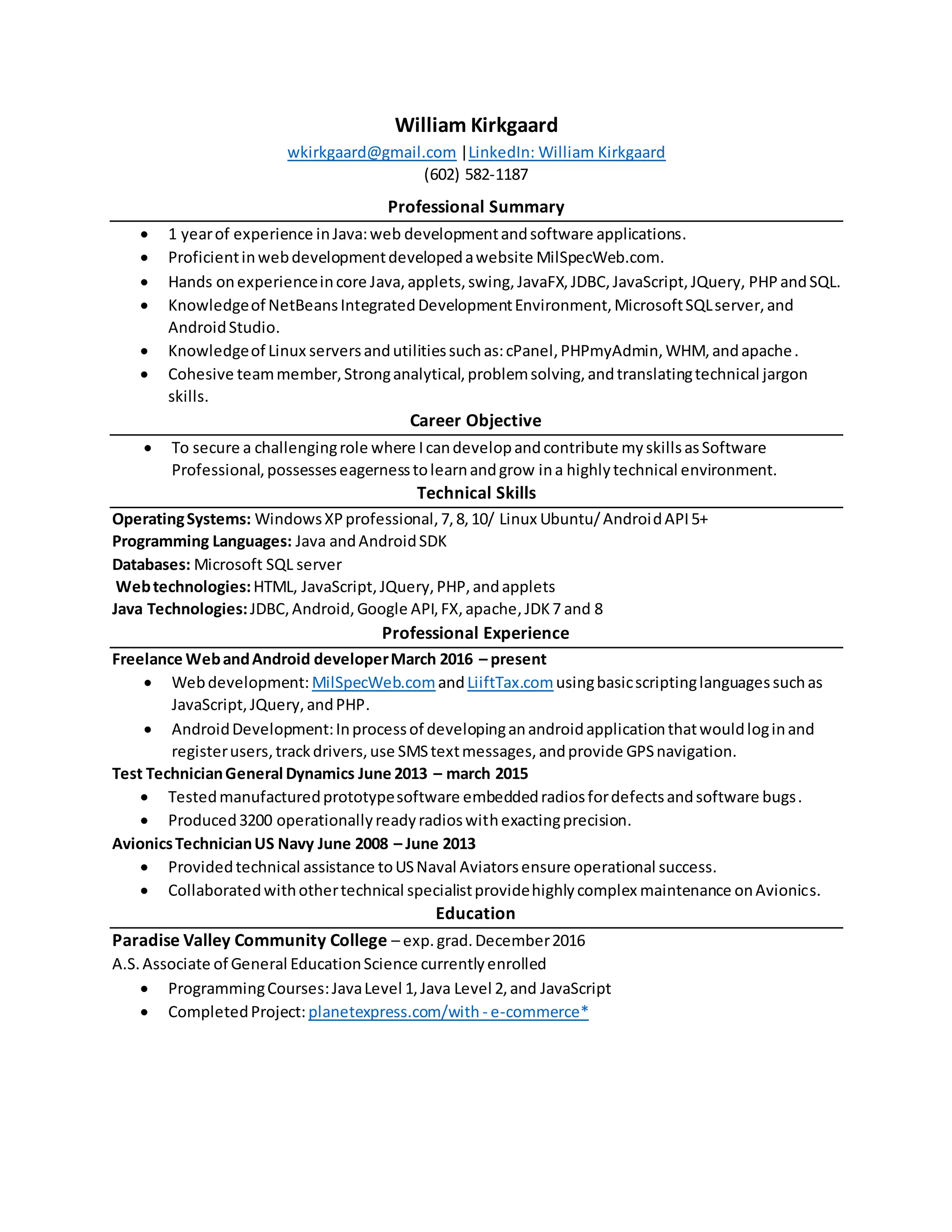 William Kirkgaard has over 1 year of experience in Java web development and software applications. He is proficient in web development and developed the website MilSpecWeb.com. He has hands-on experience with core Java, applets, swing, JavaFX, JDBC, JavaScript, JQuery, PHP and SQL. He is currently working on developing an Android application for user login/registration, driver tracking, SMS messaging and GPS navigation. His objective is to secure a challenging role where he can develop and contribute his skills as a Software Professional.