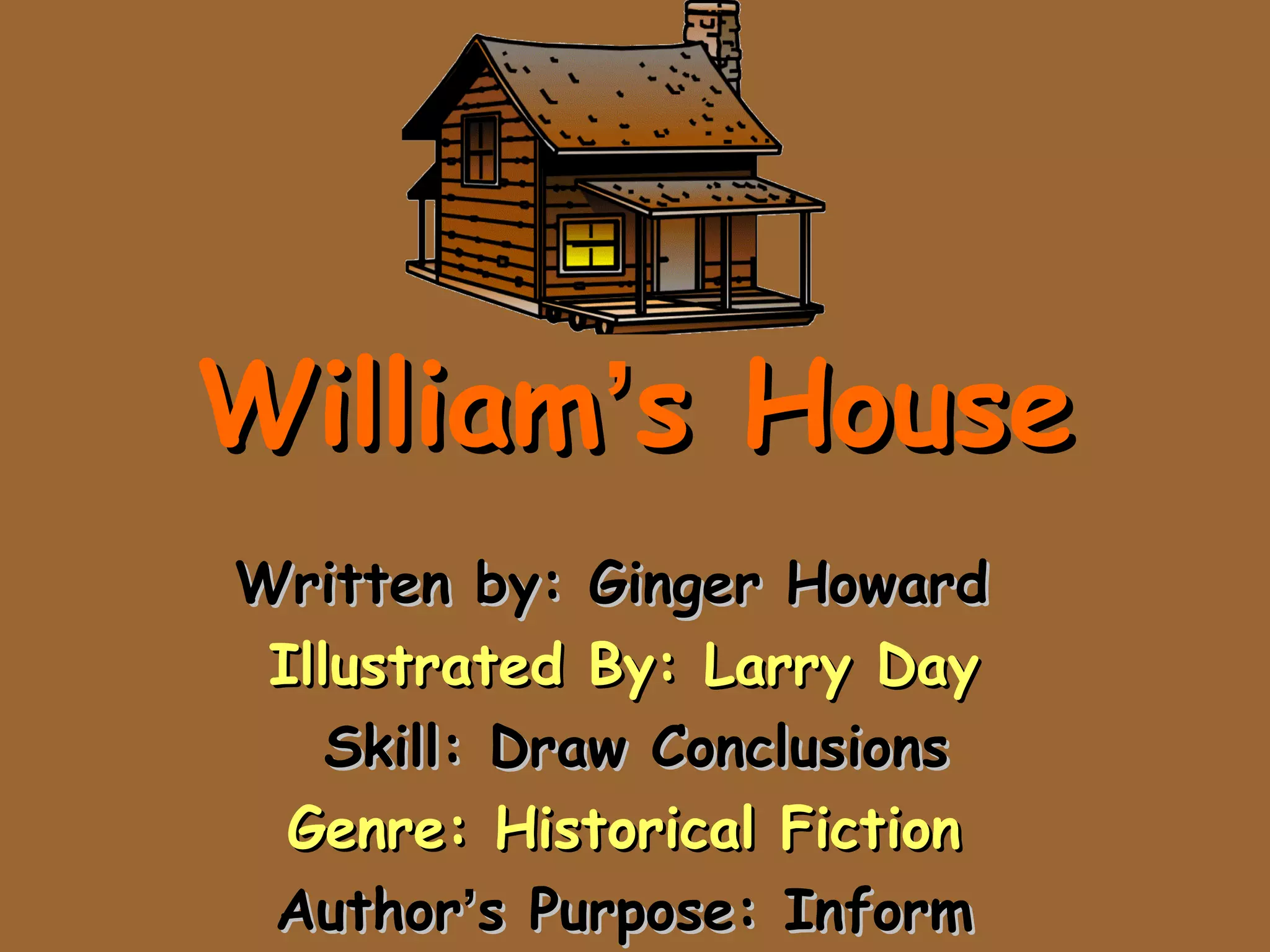 William's Houses is a historical fiction story about a boy named William who builds houses for his family. It takes place in a clearing in the forest. William knows a lot about building from his father. One house almost spoiled from the hot summer heat. Strong winds also threatened the family by almost caving in the roof. William fixes the roof and helps his family stay warm in the cold weather by making improvements to their house.