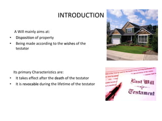 The document provides an overview of wills under Indian law, detailing their types, the process of creating and revoking them, and the role of executors. It outlines who is eligible to make a will, the necessity of registration, and the significance of probate and letters of administration. Additionally, it emphasizes the importance of having a clear testamentary capacity and provides guidelines for the appointment of executors.