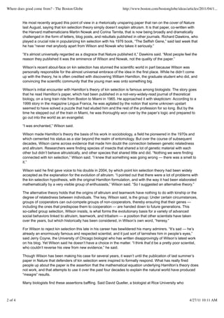 Edward Wilson, a renowned biologist, is challenging established evolutionary theory by arguing that kin selection does not adequately explain the origins of altruism. He contends group selection, not genetic relatedness, drives the evolution of advanced social behaviors like altruism. This view has outraged many scientists, including Richard Dawkins, who see kin selection as fundamental. The debate centers around complex mathematical models and whether group or individual selection dominates evolution. Wilson believes this idea, though controversial, will provide new insights into human social evolution.