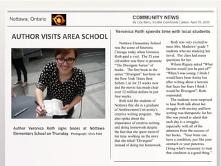The document describes the annual Choosing Ceremony where 16-year-olds choose their faction, with many transferring factions this year. It then discusses author Veronica Roth visiting a local school to discuss her Divergent series and her own struggles. Finally, it reports that a Dauntless initiate was stabbed in the eye during initiation, causing him to leave Dauntless as factionless.