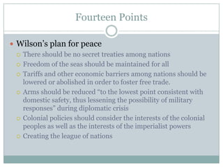 President Wilson proposed the Fourteen Points plan for a just peace after World War I that included open diplomacy, free trade, and a League of Nations. However, France and Britain rejected Wilson's plan and imposed a harsh Treaty of Versailles on Germany that crippled its economy through war reparations and territorial losses. The treaty was also criticized for not respecting Woodrow Wilson's principle of self-determination for colonized peoples. While Wilson advocated for US membership in the League of Nations, the US Senate refused to ratify the treaty, leaving the country isolated and the League weakened.