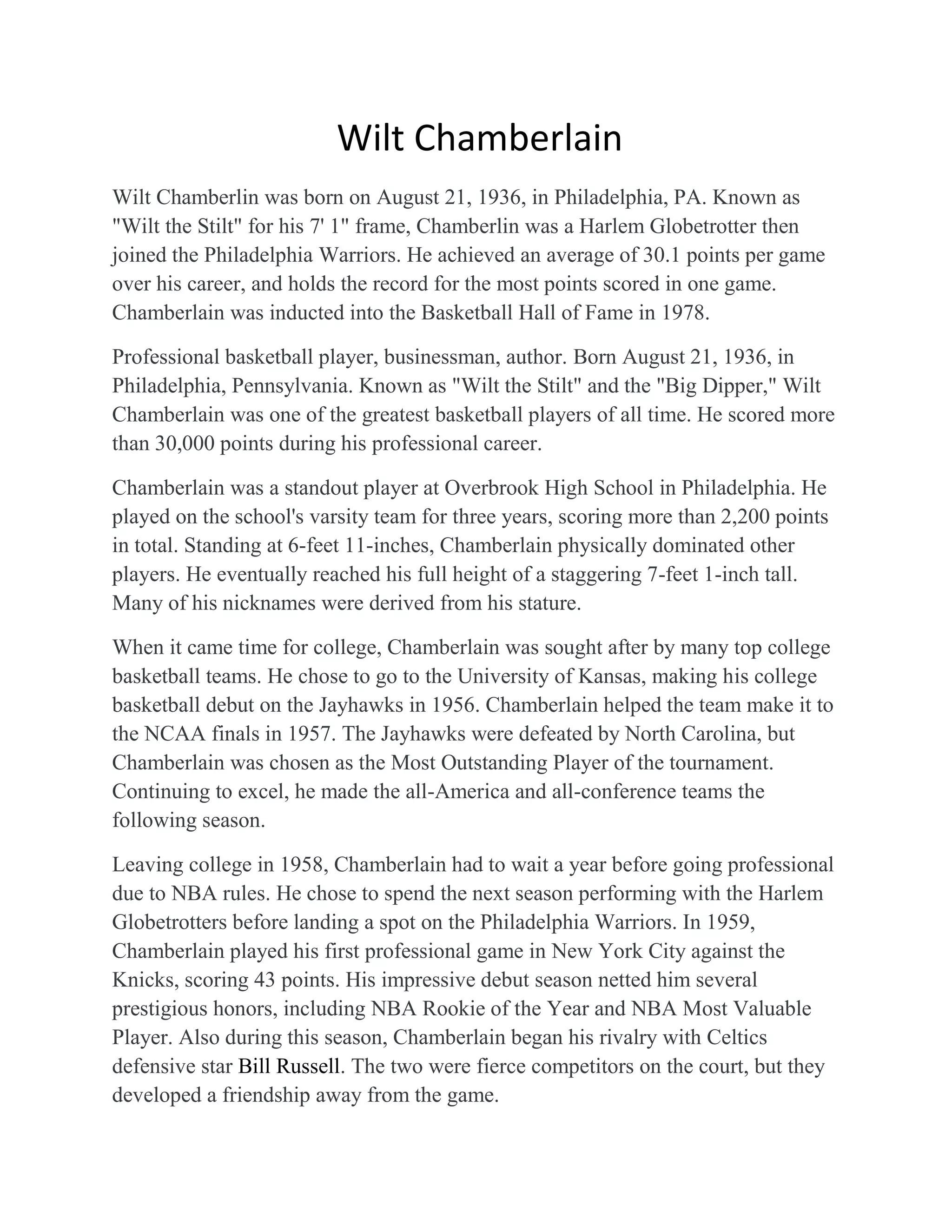 Wilt Chamberlain was a professional basketball player born in 1936 in Philadelphia. Standing at 7'1", he was known as "Wilt the Stilt" and dominated the game in college at the University of Kansas and professionally with the Philadelphia/San Francisco Warriors, Philadelphia 76ers, and Los Angeles Lakers. Chamberlain held numerous NBA records, including scoring 100 points in a single game in 1962 and averaging over 50 points per game for an entire season. He was inducted into the Basketball Hall of Fame in 1978 and remained one of the greatest players in NBA history until his death in 1999.