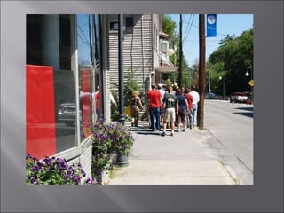 The document discusses suggestions for improving the attractiveness and walkability of downtown Wilton, Maine. It identifies several areas that could benefit from landscaping, sidewalk repairs, signage improvements, and maintenance such as trimming overgrown vegetation. Specific locations mentioned include the town boat dock, Wilson Stream bridge, Lake Road footpath, and areas around businesses on Main Street. The goal is to create a more visually appealing and pedestrian-friendly downtown environment through minor changes and beautification efforts.