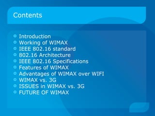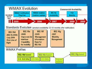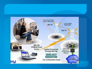 WIMAX is a wireless technology that provides broadband connectivity over long distances in a variety of ways. It uses towers to transmit high-speed internet access to receivers within a range of up to 50 km. WIMAX has several advantages over existing wireless technologies like WiFi and 3G, such as higher speeds, broader coverage areas, and lower infrastructure costs. While WIMAX adoption is still in early stages, it promises to deliver wireless broadband to more users at lower prices than current options.