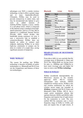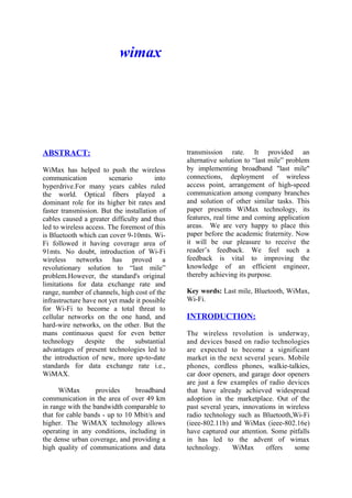 WiMax was introduced to address limitations of existing wireless technologies like Bluetooth and WiFi that have short ranges and lower data rates. WiMax provides broadband connectivity over distances of up to 50km with data rates comparable to cable. It allows for quick deployment of wireless networks without the need for cables. Key features of WiMax include flexible network architectures, high security, support for multiple service levels, interoperability between equipment vendors, portability between base stations, and soon mobility for users.