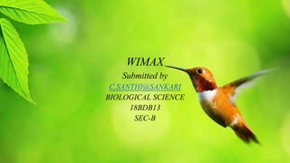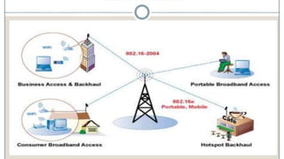 WiMax is a wireless technology that provides broadband internet access over long distances. It has several benefits over traditional internet connections like faster speeds, wireless connectivity without cables, and broad coverage across cities. WiMax can be used to provide portable mobile broadband, wireless internet alternatives to cable/DSL, data services, and business continuity. While it offers high speeds, coverage, and lower costs than other options, WiMax also has disadvantages like signal interference from weather and potential lower speeds with many users.