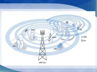 The document provides an overview of WiMAX technology, detailing its definition, building blocks, services, security functions, and specifications. It highlights the characteristics of WiMAX as a wireless communication technology that enables broad coverage and high-speed data transmission without the need for cables. Additionally, it compares WiMAX to other wireless technologies such as Wi-Fi, emphasizing its advantages in speed and range.