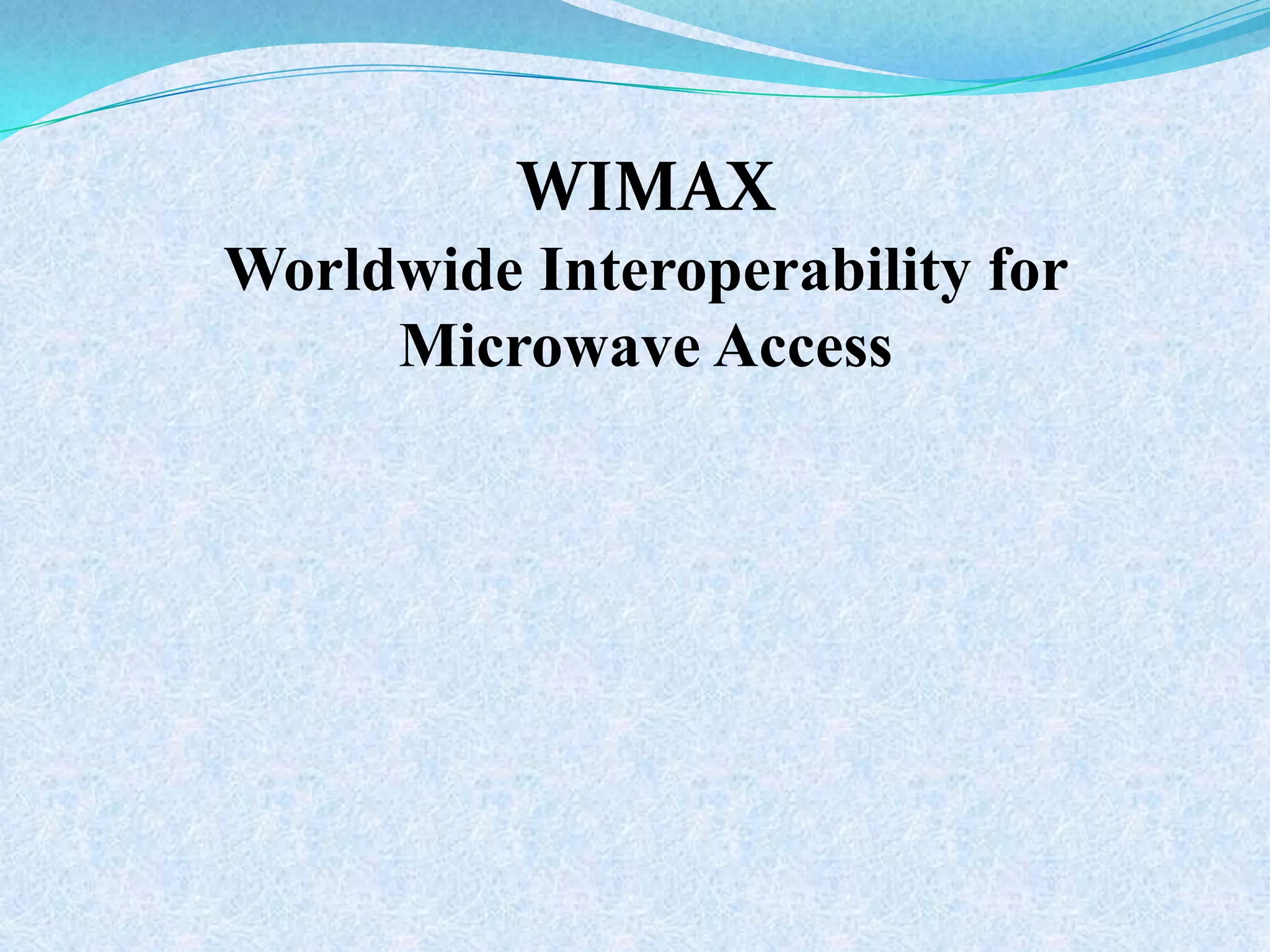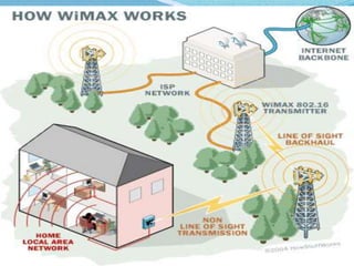 This document discusses WiMAX (Worldwide Interoperability for Microwave Access), a wireless technology that can provide broadband internet access over long distances. It describes WiMAX's ability to connect devices using wireless signals instead of cables. The document outlines WiMAX's history, how it works by transmitting signals between towers and receivers, its applications for broadband internet access, and its advantages of low cost and wide coverage though it has disadvantages like needing line of sight and being power intensive.