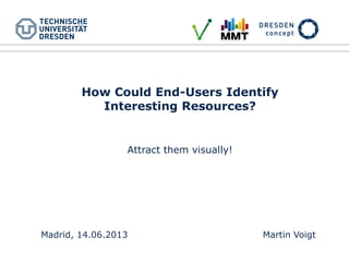 Martin Voigt presents a concept for developing a user interface and backend system to help end-users identify interesting resources from large semantic web datasets. The presentation outlines motivations like the growing amount of data and end-users' lack of programming skills. An iterative user study informed the design of an intuitive interface with visualization and interaction techniques. The backend uses objective measures, annotations, and recommendations to filter and analyze data accessible through a RESTful API. The goal is to assist end-users in exploring semantic web data through understandable visualizations and easy interaction tasks.