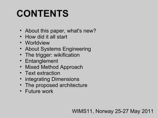 This document discusses developing a shared vocabulary for systems engineering by migrating content from documents to a wiki environment. It addresses challenges like justifying an open approach, determining the best structure for the wiki, and establishing governance models for multi-author teams. The paper proposes an integrated architecture using techniques like text extraction, morphological analysis, and integrating different dimensions to develop and manage the shared vocabulary in a wiki.