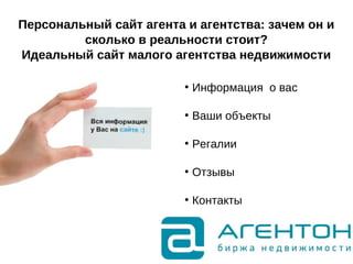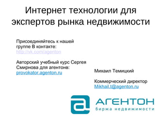 Документ описывает интернет-технологии, необходимые для успешной работы агентств недвижимости, включая создание персонального сайта и использование рекламных инструментов. Основное внимание уделяется важности качественной витрины объектов и эффективной рекламной стратегии, включая SEO и контекстную рекламу. Также рассматриваются инструменты для управления клиентами, аналитики и хранения данных.