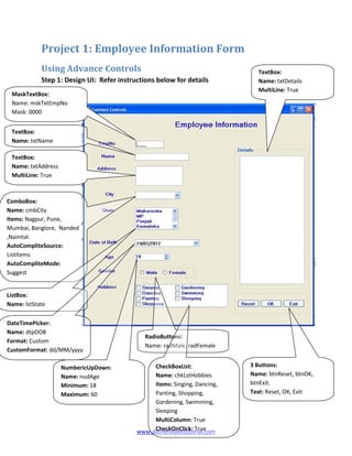 The document outlines a tutorial for creating an employee information form using advanced controls in Windows Forms, including various input elements like textboxes, comboboxes, and listboxes. It explains the necessary steps to design the user interface, add event handlers, and dynamically populate controls. Key functionalities include form validation, data retrieval, and resetting input values, along with programming tips such as using StringBuilder for string concatenation.