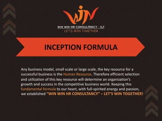 Win Win HR Consultancy focuses on providing tailored human resource solutions to enhance organizational growth and success through effective recruitment and management strategies. With a mission to deliver high-quality, ethical services and a commitment to matching the right candidates with the right roles, the firm serves various industry sectors. Their comprehensive approach includes a diverse range of HR services, ensuring client satisfaction and maintaining strong ethical standards.