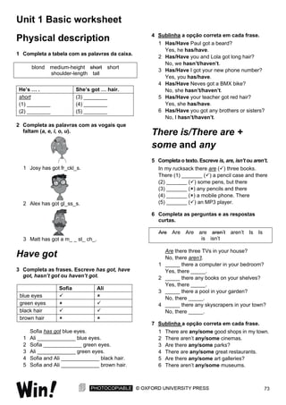 The document is a worksheet in Portuguese for students learning about physical descriptions, possession (using "has/have got"), and existence (using "there is/are"). It contains multiple choice questions and fill-in-the-blank exercises covering these grammar points. The questions ask students to describe people's appearances, indicate possession of objects, and talk about what exists or doesn't exist in various places using "is", "are", "has/have got", "isn't", "aren't", and "there is/are".