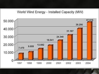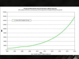 Wind energy is the fastest growing renewable energy source. It has huge potential to contribute to worldwide energy demands. While wind turbines effectively harness wind power, concerns remain around their visual and noise impacts. Ongoing technological advancements are helping address these issues and reduce costs, positioning wind energy for significant further growth.