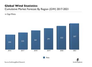 The 'Wind Asia Ecoenergy Book 2017' highlights Asia's leadership in the wind energy market, with over 203 GW of installed capacity primarily driven by China and India. The book also provides insights on the history, current statistics, major manufacturers, and energy storage solutions related to wind energy in the region. Additionally, it aims to serve as a resource for business development, localization, and outsourcing in the wind energy sector.