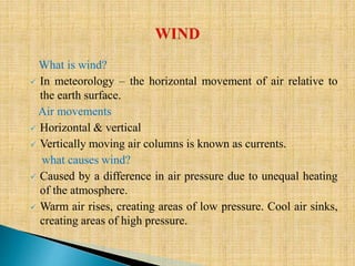 This document provides information about winds and the factors that influence them. It discusses: