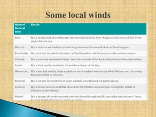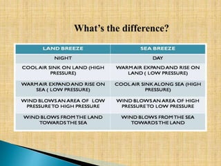 - Features of different wind types like the doldrums, trade winds, westerlies, and polar easterlies. It also discusses monsoons, land/sea breezes, and valley winds.