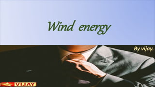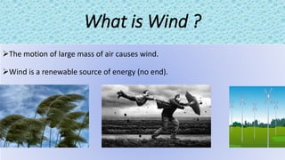 Wind is caused by the motion of large air masses and is classified based on speed. It is a renewable source of energy that flows from high to low pressure areas. Wind turbines convert the kinetic energy of wind into mechanical rotation through their blades, and then into electrical energy, providing a pollution-free source of power. While wind energy has advantages like being free and reducing carbon emissions, it also has limitations such as only being available intermittently and turbines requiring high maintenance costs.