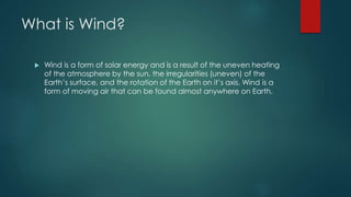 Wind energy is a renewable source of electricity that is plentiful, clean, and efficient. Wind turbines convert the kinetic energy of wind into electrical energy through the use of propeller-like blades that spin a shaft which is connected to a generator. One of the oldest uses of wind energy dates back to 5000 BC when wind-propelled boats were used on the Nile River. Today, wind energy provides electricity to over 100 countries and is growing to be one of the most efficient energy sources available. While wind energy has advantages such as being clean and renewable, it also has disadvantages like only being suitable for particular regions and being unpredictable since it relies on wind patterns.