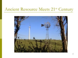 The document discusses the evolution and significance of wind energy, detailing its historical context, advantages such as environmental benefits and cost stability, and design factors influencing energy generation. It highlights challenges including grid connectivity and potential impacts on birds, while also presenting economics of wind farm construction. The future projections suggest a goal of 6% of the nation’s electricity supply from wind energy by 2020 with increased turbine capacity.