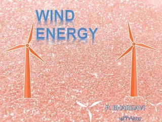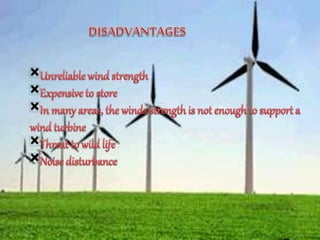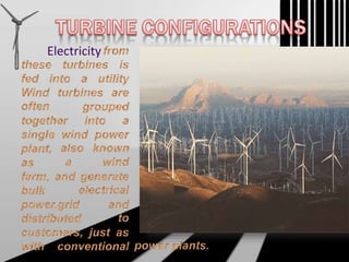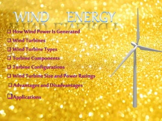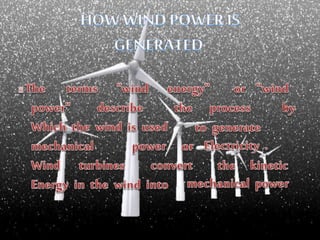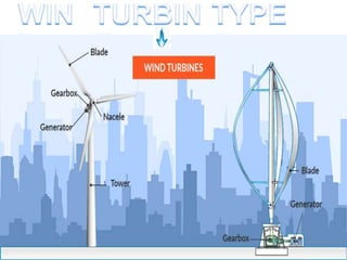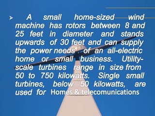 Wind is a form of solar energy caused by uneven heating of the atmosphere from the sun and earth's rotation. Wind patterns are modified by terrain, bodies of water, and vegetation. This wind motion can be captured by wind turbines to generate electricity. Wind turbines use components like blades, a shaft, gearbox, and generator to convert the kinetic energy of wind into electrical energy that can charge batteries. India has significant wind power generation capacity across its states totaling over 20,000 megawatts.